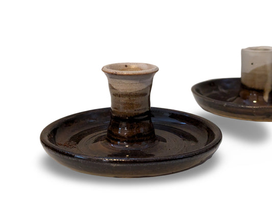 Pair of Vintage Mid-Century Modern Studio Pottery Candle Holders – Brown and White Glaze