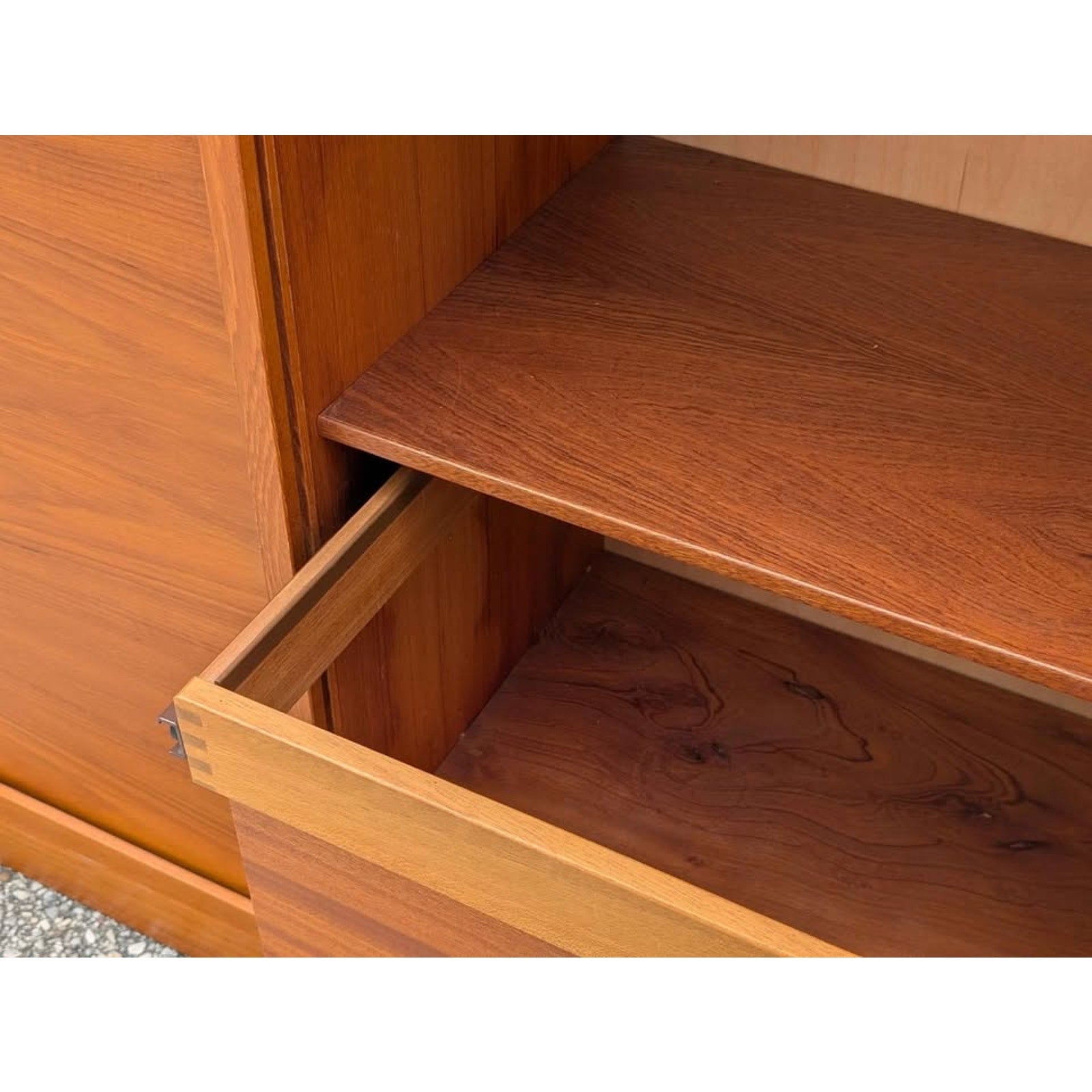 In excellent condition, this piece showcases a glowing teak wood and features dual tambour doors for a touch of mid-century modern elegance.