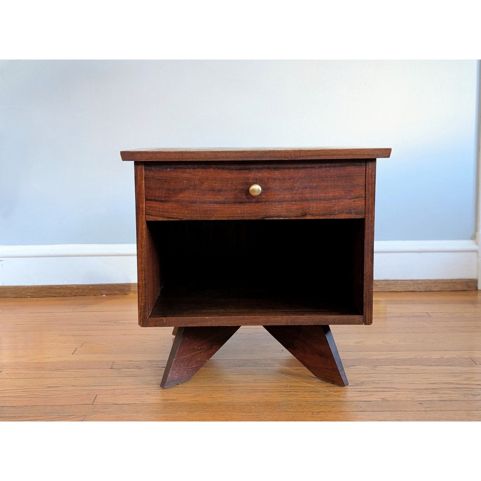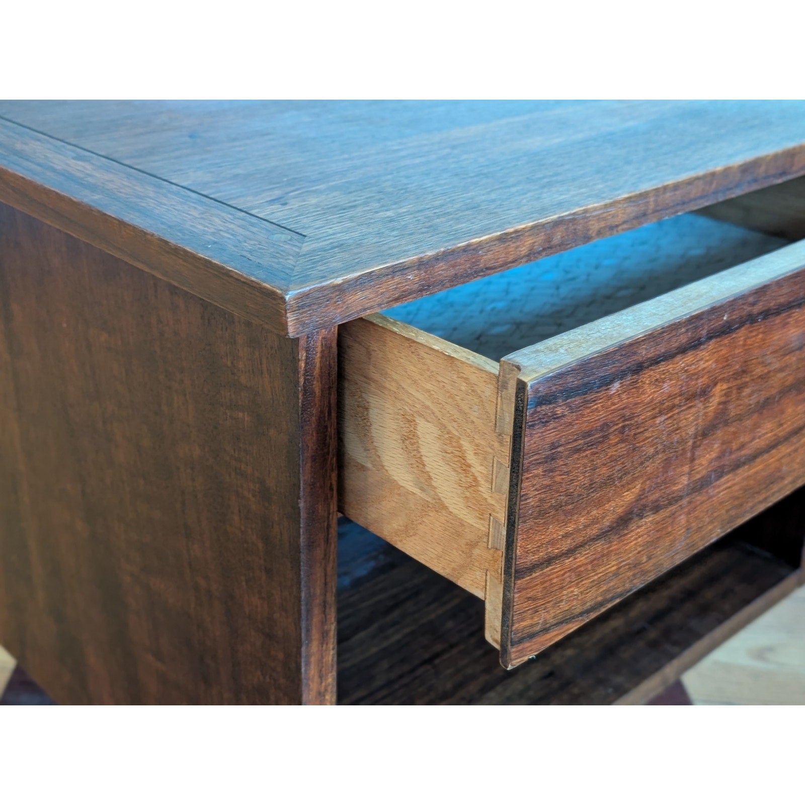 This exceptionally rare mid-century modern nightstand is from George Nakashima's iconic Origins Collection for Widdicomb (circa 1958–1960). The design combines Shaker-inspired simplicity with subtle Japanese influences, featuring clean lines, balanced proportions, and a focus on the natural beauty and grain of the East Indian laurel wood.