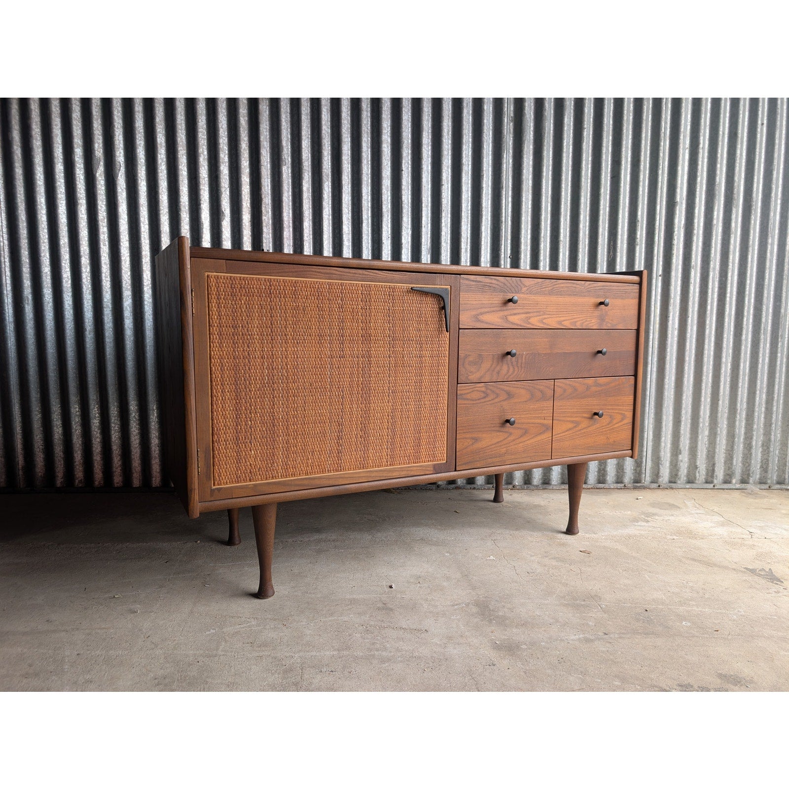 Vintage mid century modern solid oak credenza designed by Heywood Wakefield. This hard to find design features black aluminum pulls and a cane-accented cabinet door, offering a clean and functional layout consistent with classic American MCM furniture.