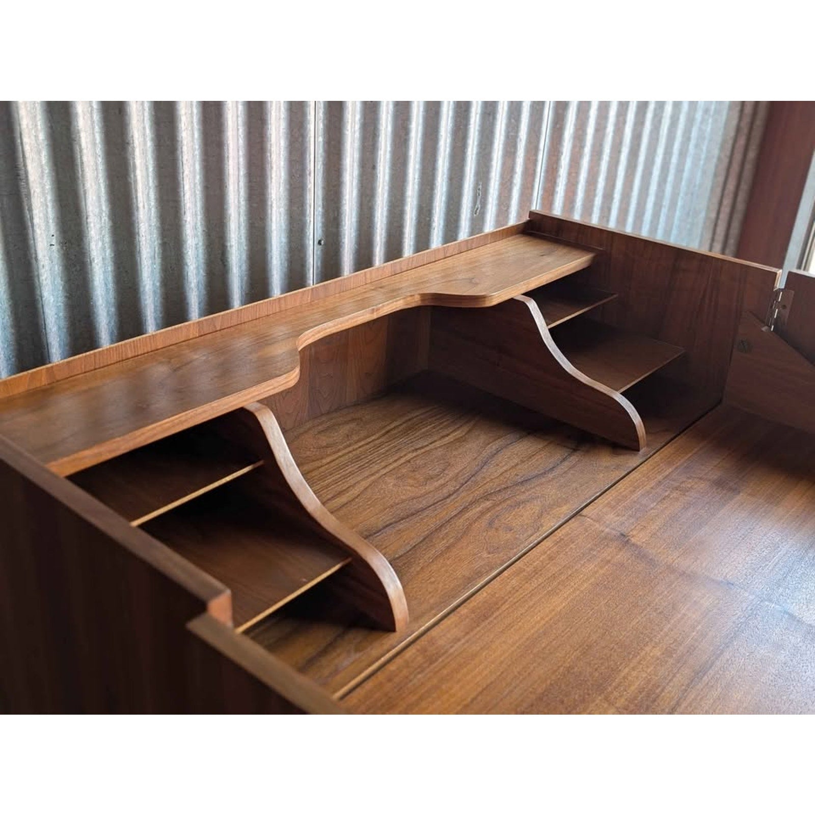 Perfect as a credenza for storage, it easily transforms into a desk when you flip it open. This compact piece is incredibly functional and ideal for small spaces. Don't miss out on this versatile and stylish addition to your home!