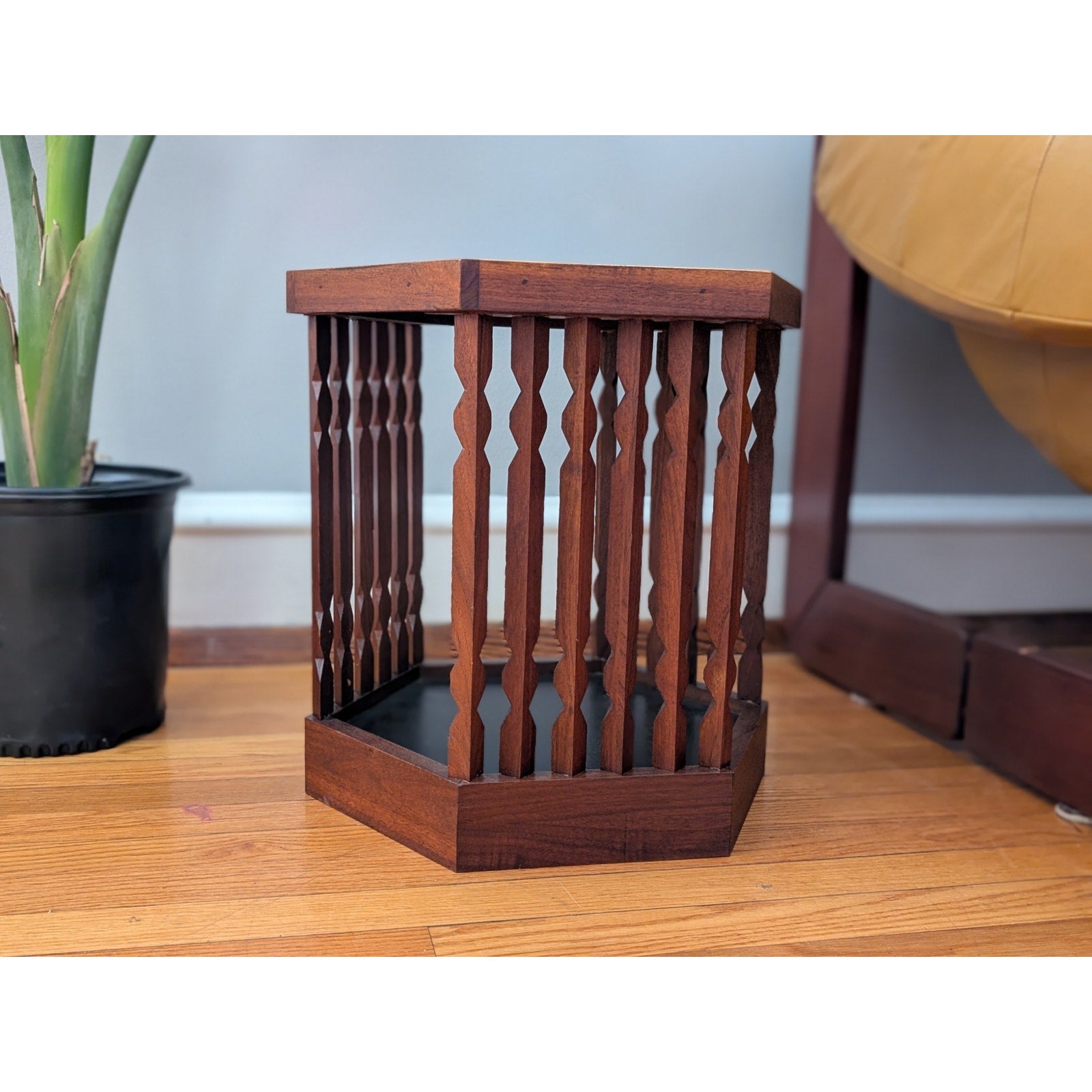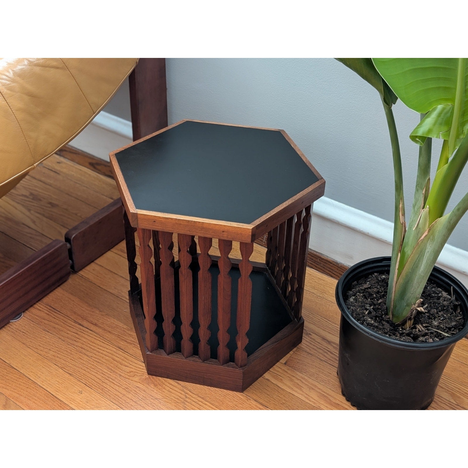 Keywords: mid-century modern side table, Arthur Umanoff furniture, vintage walnut table, black laminate table, retro side table, mid-century decor, vintage furniture, Umanoff design, retro home decor, walnut and laminate furniture.