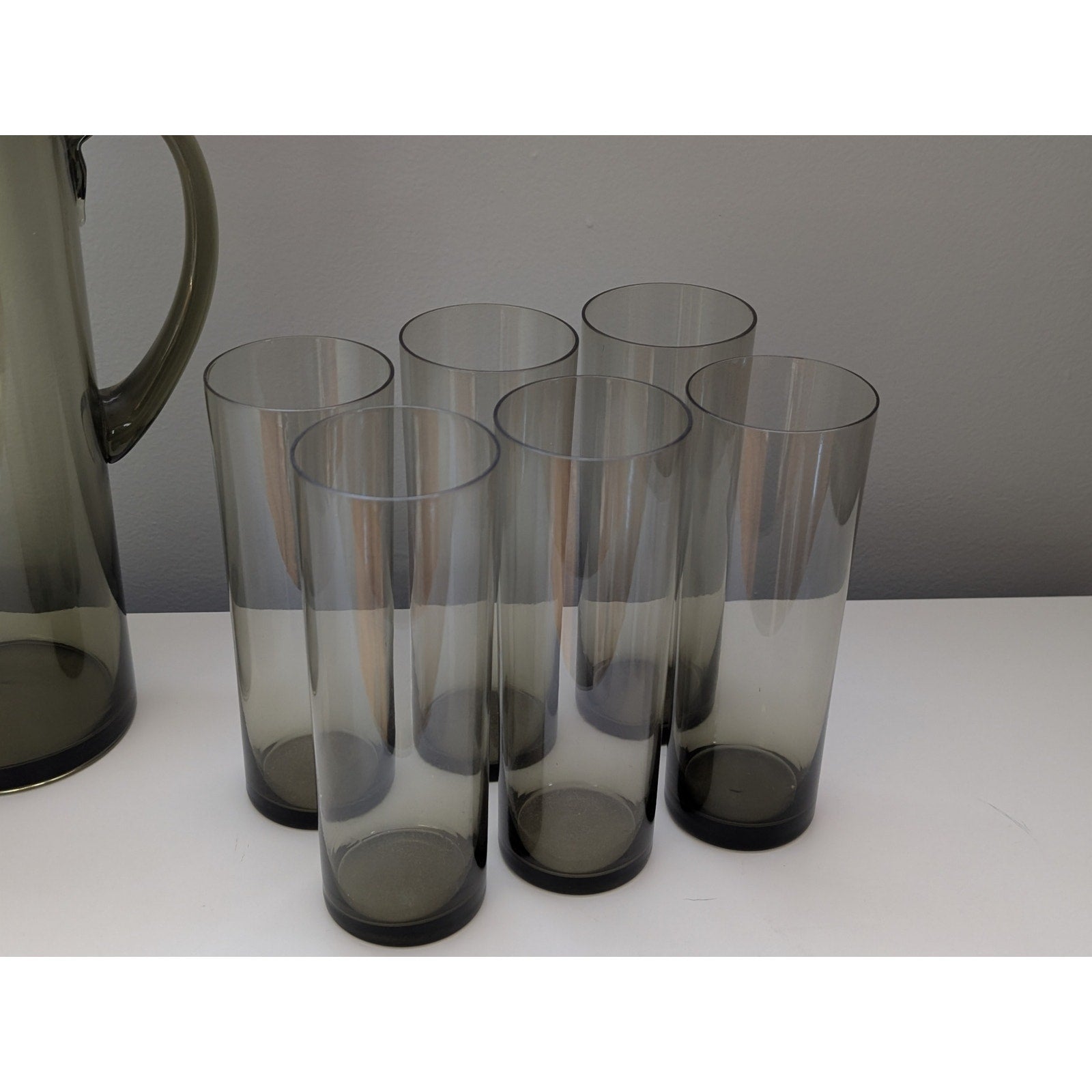 Vintage mid-century modern smoked glass lemonade set featuring a tall matching pitcher and six highball glasses. With its sleek silhouette and smoky tint, this set reflects the clean lines and understated elegance of classic mid-century glassware design.